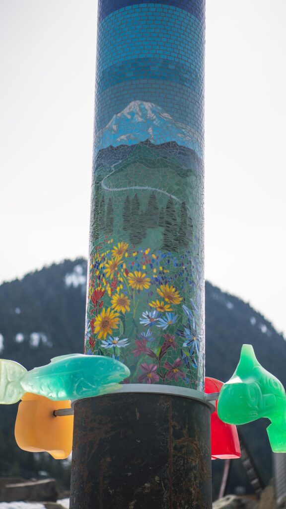 After receiving over 40 art submissions, we were captivated by Seattle-based artist, Mary Iverson. Nestled at the base area now stands the ‘Circle of Life Tower’, a representation of our role within the environment and surrounding land. Mary’s art tells a story; with the attention centered on the heart and soul of the mountain. Iverson, who is recognized for her landscape paintings, created the ‘Circle of Life Tower’ from steel, wood, tile mosaic, and mixed media through collaboration with Muckleshoot traditional wood carver Keith Stevenson, Dillon Works Fabricators, and Tieton Mosaics. It was a priority for Iverson to work with a Muckleshoot artist to embrace the tribe’s historical significance to the region.