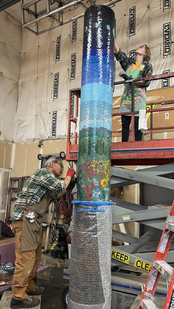 “I came up with this impossibly challenging piece of art that I had no clue how to make- I had a wonderful team to support me and we did it” Mary stated as she discussed the many hands that helped bring this vision to life. With help from Crystal Mountain, Keith Stevenson, Dillion Works Fabricators, and Tieton Mosaics, each member brought their expertise and resources, contributing to the success of the endeavor.