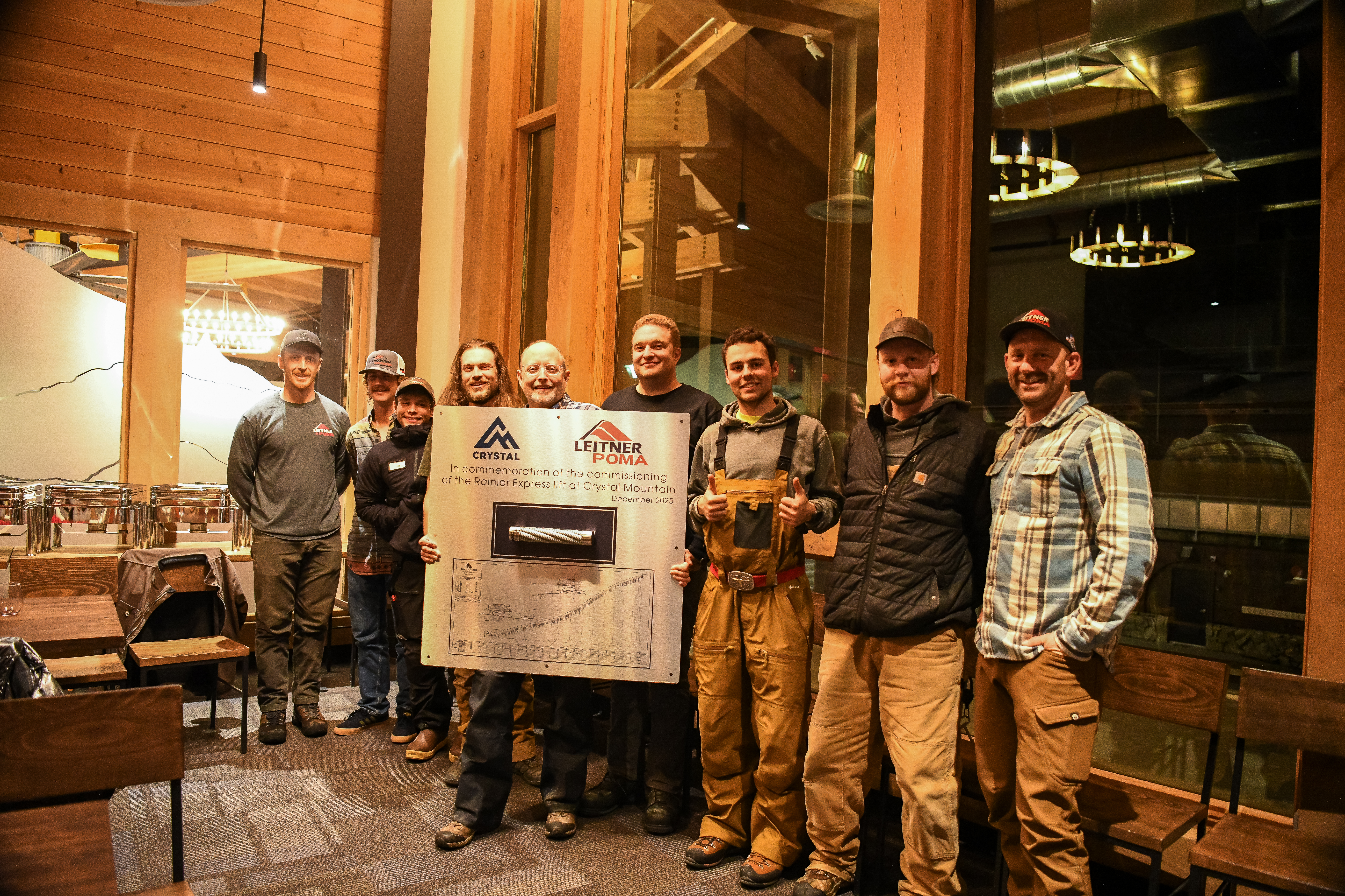 And of course, we had to celebrate the team. After the long load test, everyone came together to recognize the work that brought REX back, and we thank Leitner-Poma for the beautiful plaque commemorating Rainier Express. Cheers to all of you.